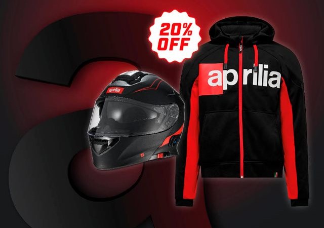 *Das Angebot gilt für die unverbindliche Preisempfehlung in offiziellen Online-Shops und bei teilnehmenden Aprilia-Vertragshändlern. Die Aktion beinhaltet einen Rabatt von 20% auf eine Auswahl von Artikeln, solange der Vorrat reicht. Angebotsdauer: vom 01.12.2025 bis zum 31.12.2025.